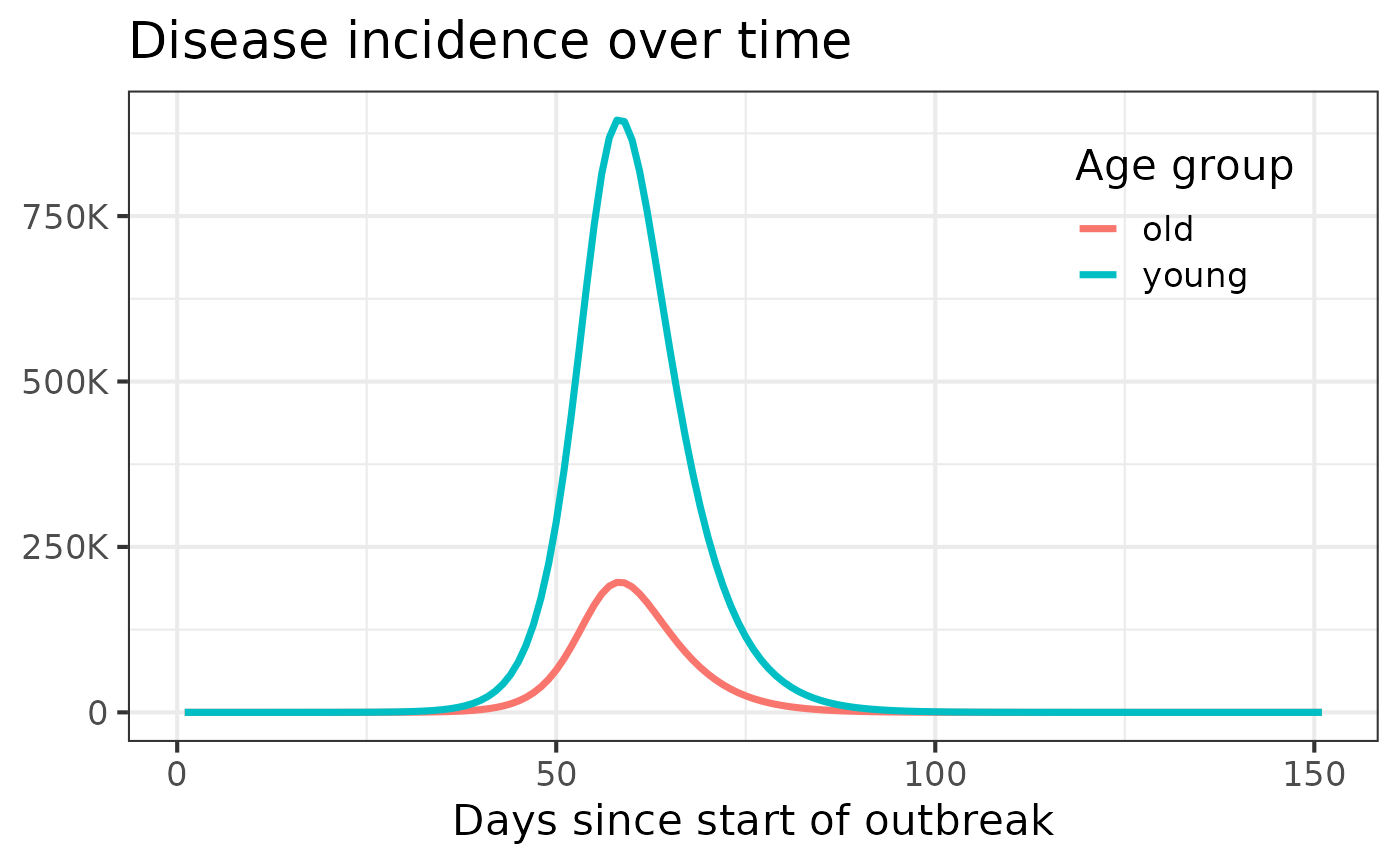 #> 12 10 D_o state 3.674943e-01The total inflow into compartments can be used to extract disease incidence by age over time: