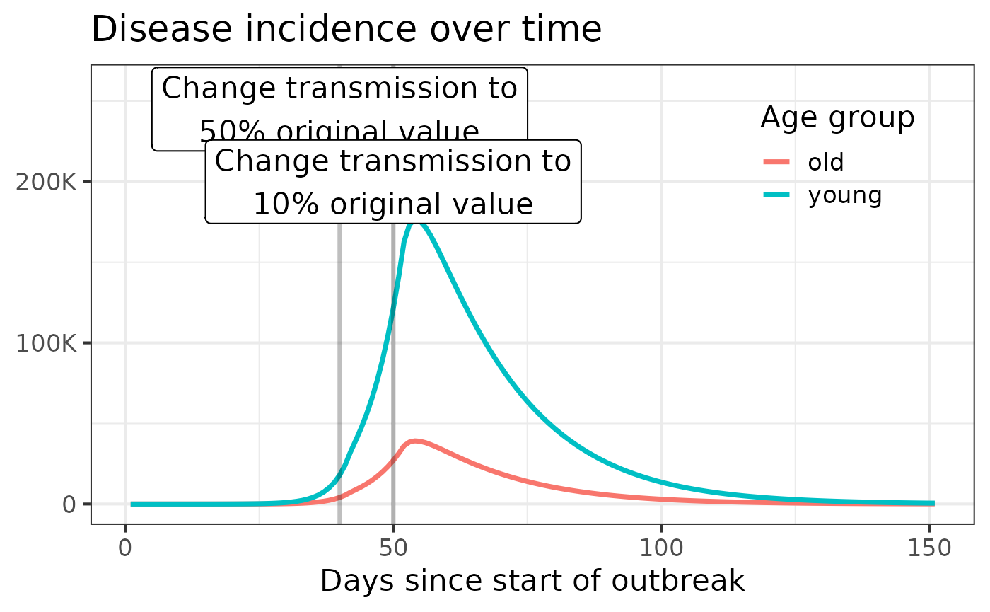 values2$transmissibility <- values2$transmissibility*(1-0.2) # reduce transmissibility by 20%#> Updating simulator values in `simulate` only supported for the `hosp` model currently.
