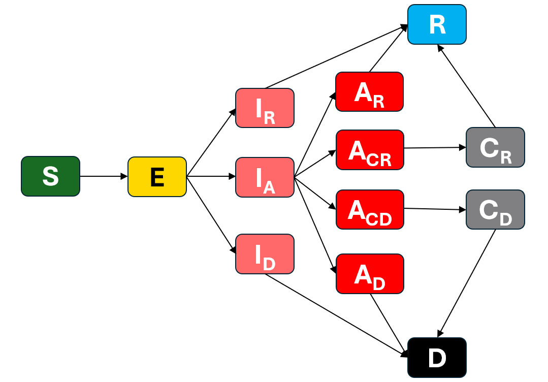 This version of the model features a basic epidemiological structure stratified with five-year age groups up to age 80. The epidemiological compartments are: